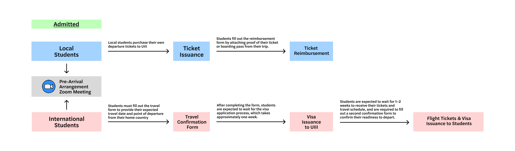 International Students: After the Zoom meeting, they fill out a travel confirmation form with their planned travel details. UIII processes their visa within about one week, then arranges flight tickets and visa issuance, which may take 1–2 weeks. Students must then confirm their readiness to depart via a second form.