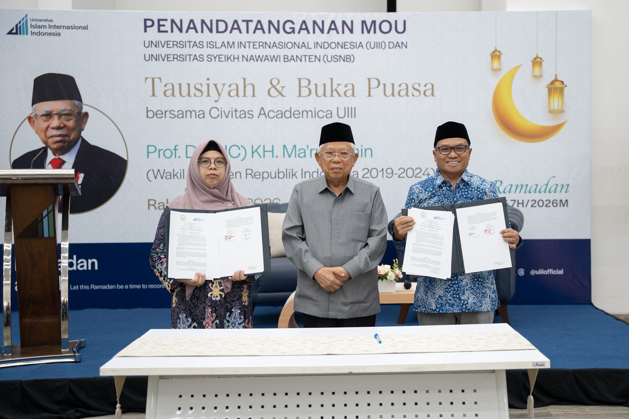 Depok, March 4, 2026 — The Universitas Islam Internasional Indonesia (UIII) hosted a special Ramadan gathering on Wednesday afternoon, marked by the signing of a Memorandum of Understanding (MoU) with Universitas Syeikh Nawawi Banten (USNB), followed by a community iftar and an inspiring religious lecture by former Vice President Ma’ruf Amin.